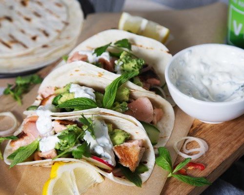 Homemade tacos loaded with a quick pickle, chargrilled veg, fish fillets and a generous dollop of spicy salsa.